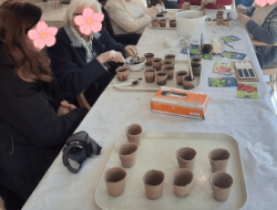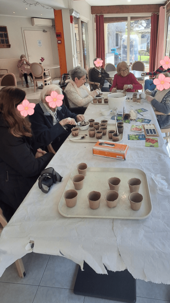 Pour celles et ceux qui ne souhaitaient pas sortir, la séance s’est poursuivie à l’intérieur, en salle de restaurant. Le matériel de jardin a été installé sur les tables. Chacun a pu participer à sa façon. Rempoter, arroser, observer… rien n’est laissé de côté. L’essentiel est d’être ensemble et de profiter.